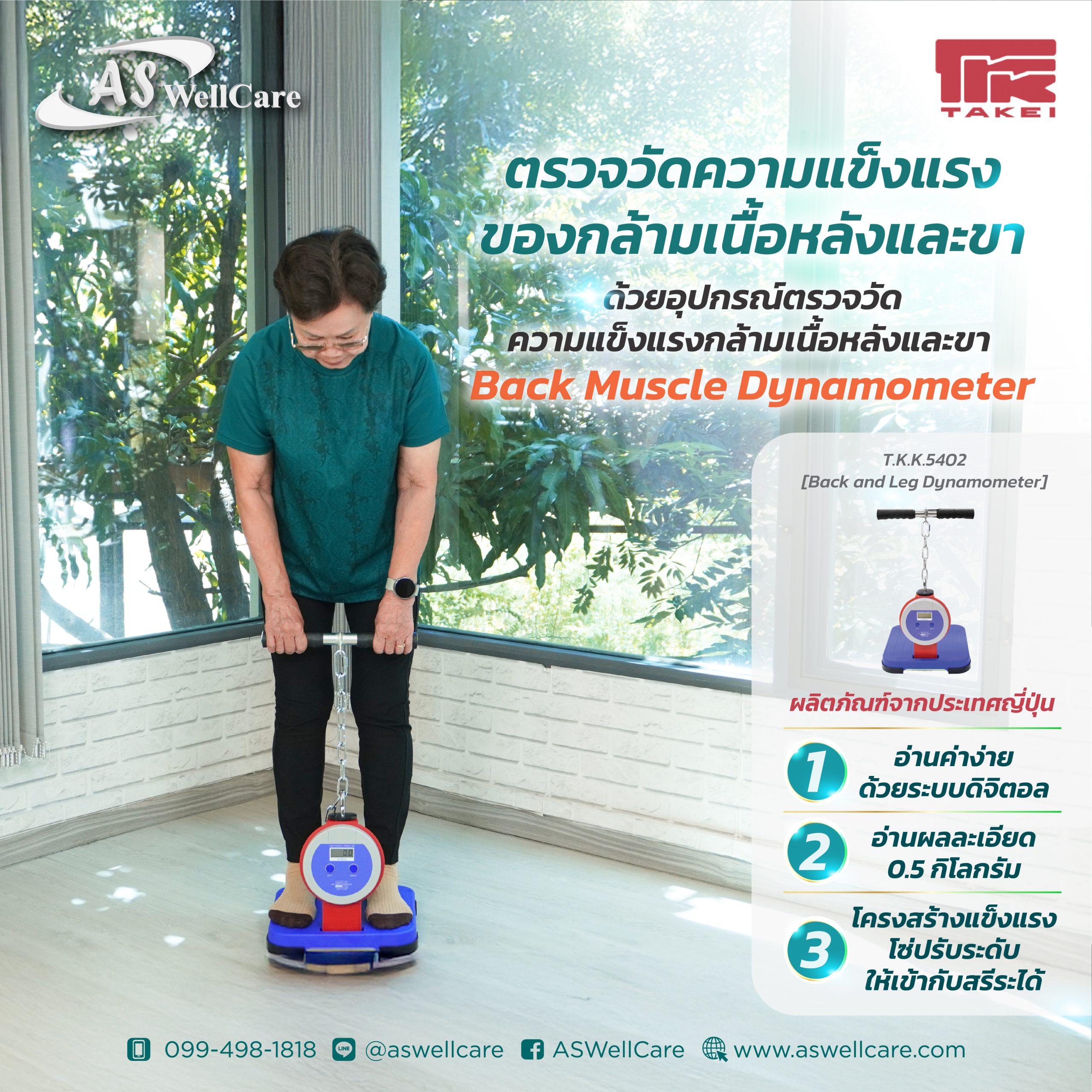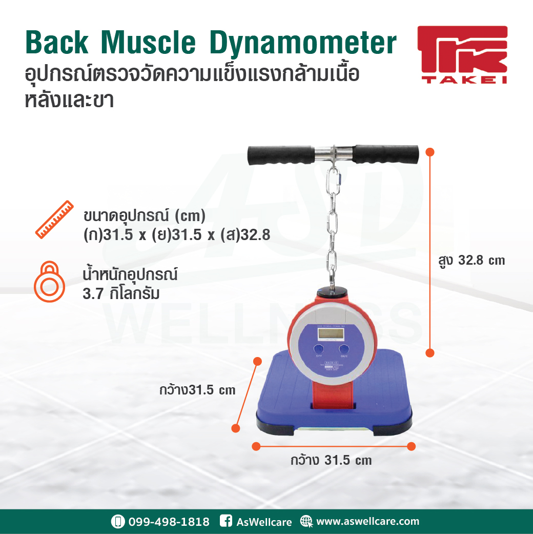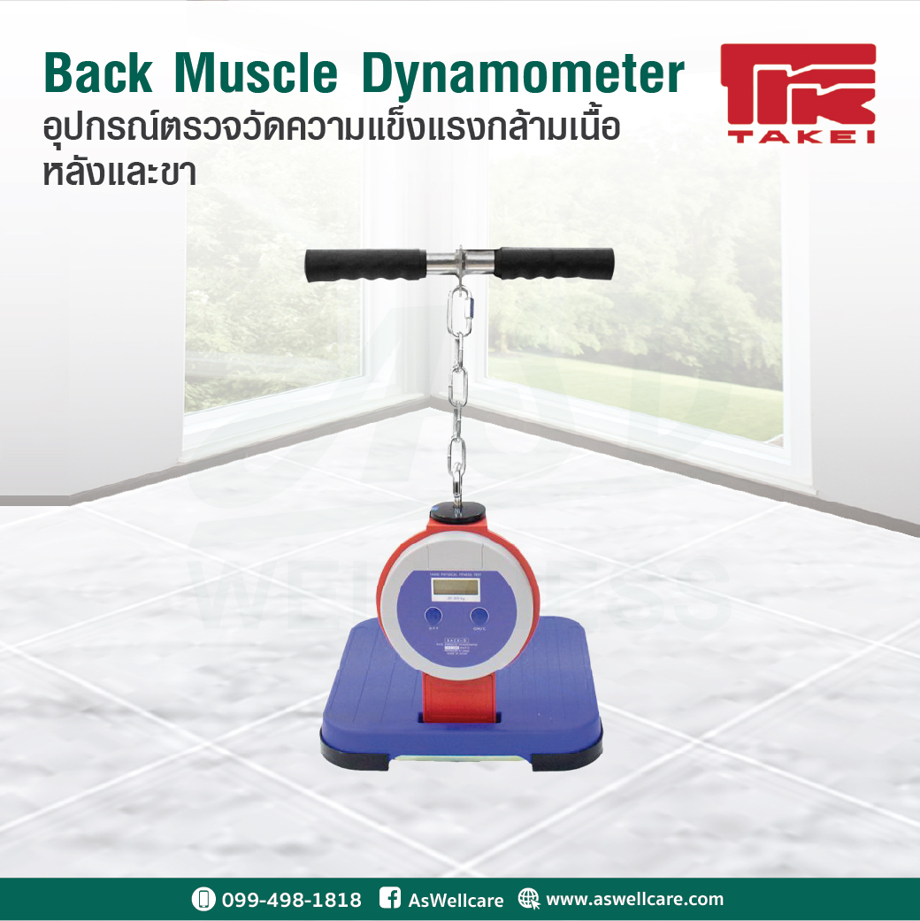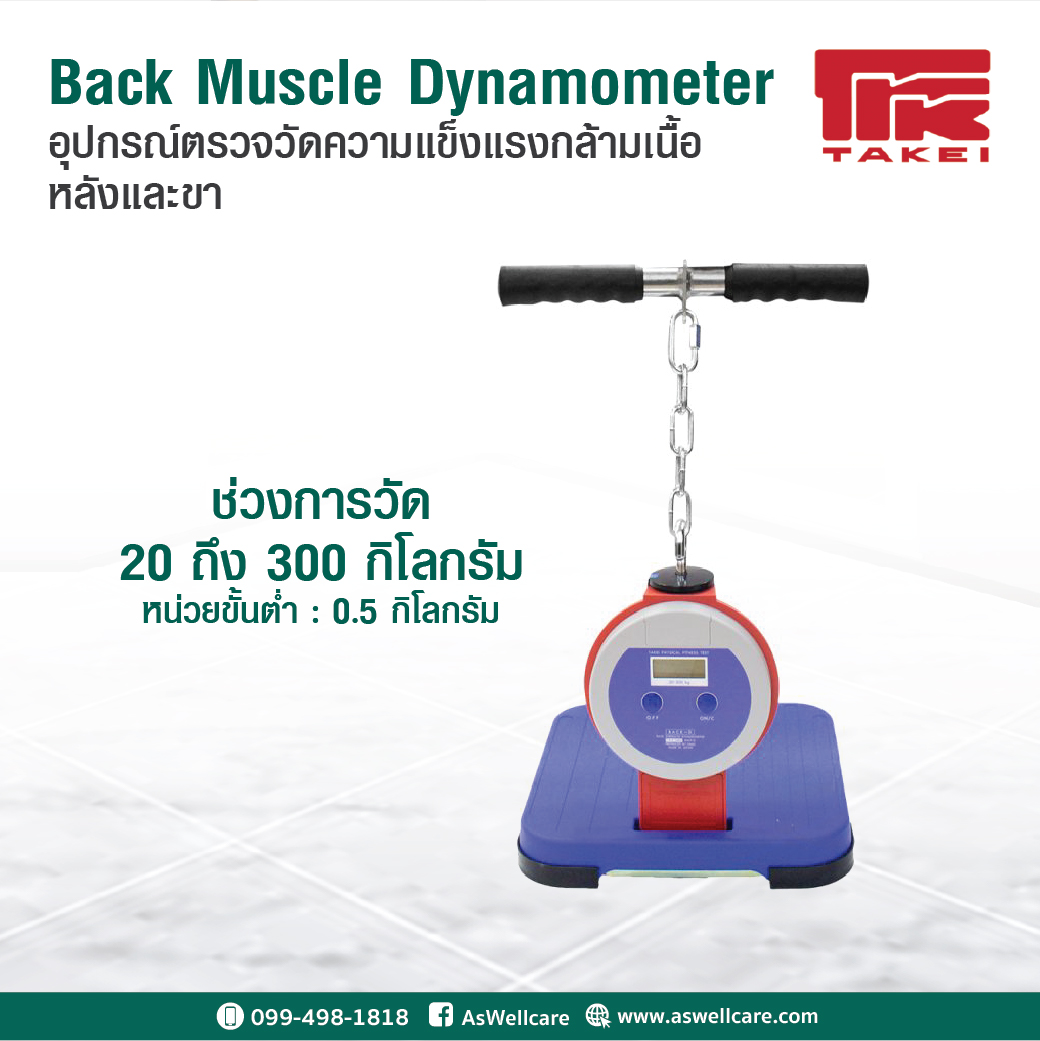 อุปกรณ์ทดสอบความแข็งแรงของกล้ามเนื้อหลังและขา (Back and Leg Dynamometer) (เครื่องวัดกำลังหลังและขา แบบดิจิตอล) (Digital Back and Leg Muscle Dynamometer) เพื่อประเมินความแข็งแรงของกล้ามเนื้อหลัง (ฺBack Extensors), ทดสอบสมรรถภาพกำลังในนักกีฬา, การประเมินก่อน / หลังการฝึกหรือโปรแกรมฟื้นฟู, และการทดสอบแรงสำหรับการวิจัยกายภาพบำบัด หรือสรีรวิทยาการออกกำลังกาย